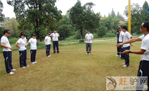 户外拓展培训项目——盲人方阵。小组全体成员在蒙住双眼的情况下,将一些绳子围成一个正方形,并且要求所有的学员均匀地分布在正方形的四条边上。一开始蒙上了眼,可能有的学员就真的蒙了来自www.ganlv5.com。慢慢的在我们大自在户外拓展培训教官的带引下,学员开始走向正轨。这个户外拓展项目培养团队成员的沟通意识;使学员理解角色定位及尽职尽责的完成本职工作的重要性。