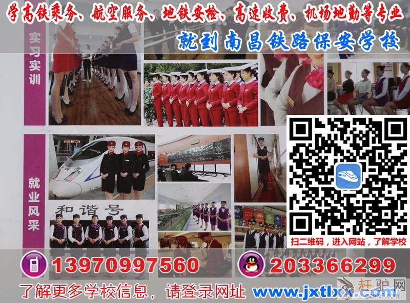 江西省属铁路学校,唯一由铁路局主办的铁路学校~南昌铁路保安中等专业学校,2020年开设:列车乘务、高铁动车乘服、轨道地铁安检、铁路运营与管理、铁路电气化供电、高速公路收费员、航空票务等定向就业专业,采取订单式人才培养模式,确保定向就业; 2020年限额招生,招满为止,联系电话:139-7099-7560(喻老师),微信/QQ:203366299,校址:南昌银三角大道669号,学校网址www.jxtlxx.com(进入网站点选“网上报名”在线报名,抢占名额)