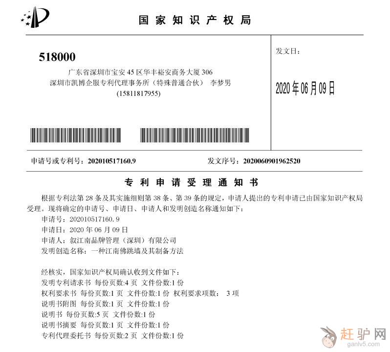 2020年6月9日,国家知识产权局正式发文,通知叙江南的“江南佛跳墙”产品专利申请已被受理来源www.ganlv5.com。本次专利申请将涉及一种江南佛跳墙及其制备方法,申请号或专利号为:202010517160.9VZT。
